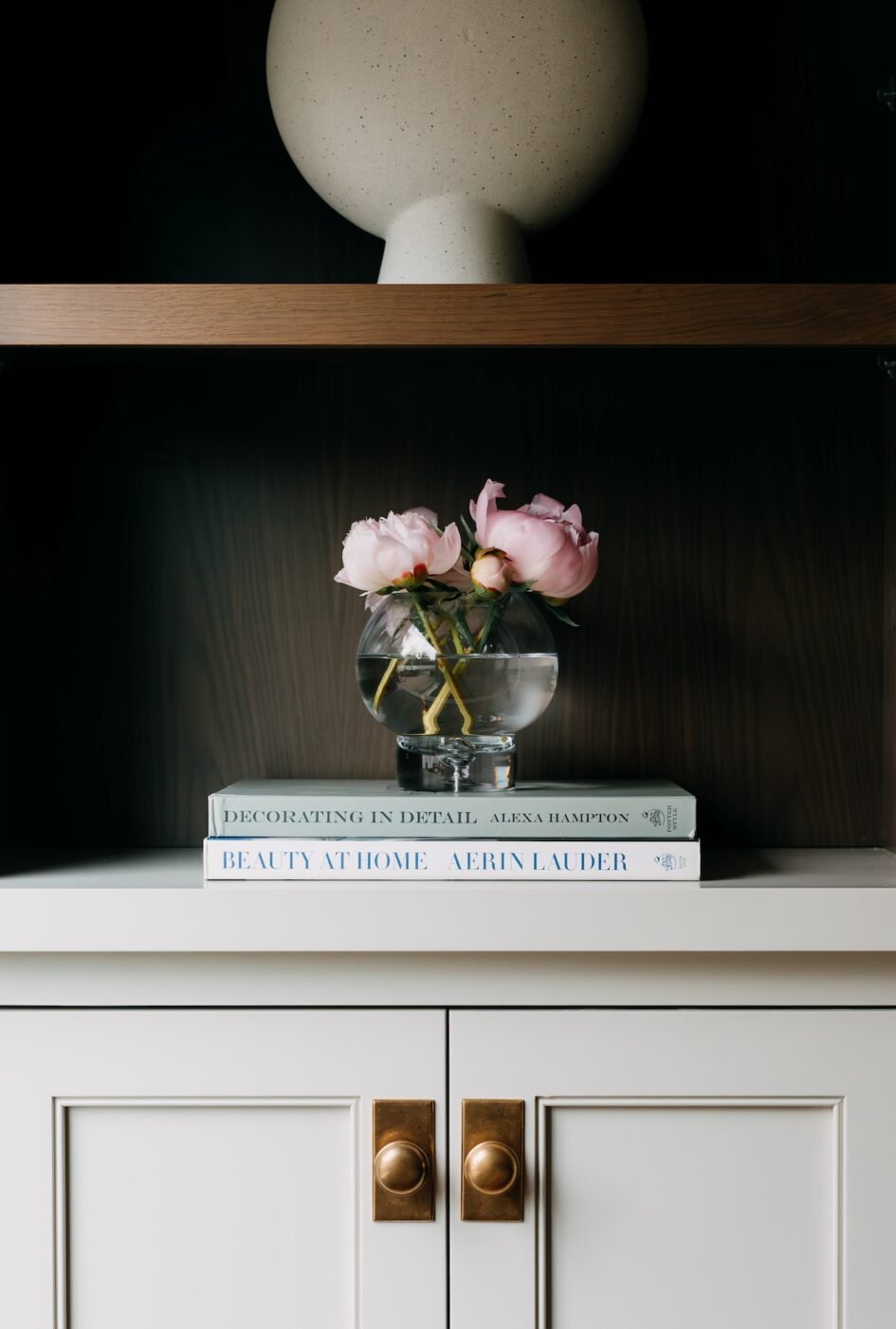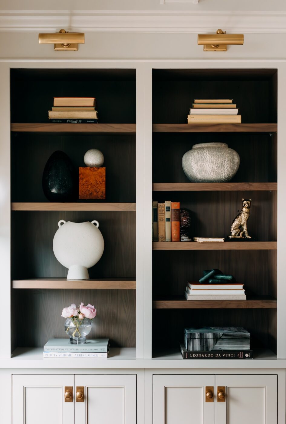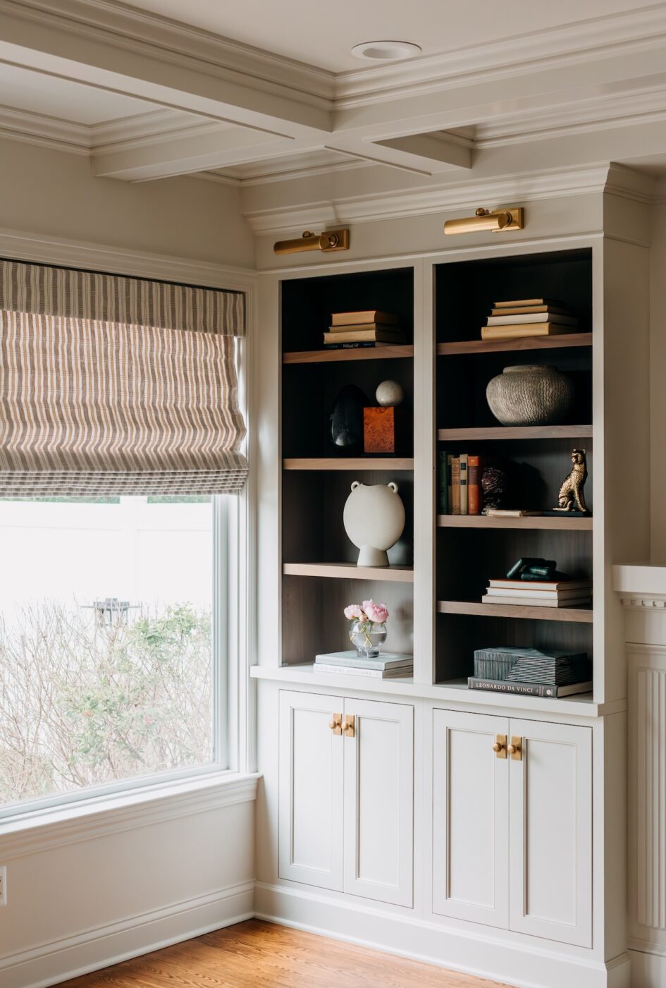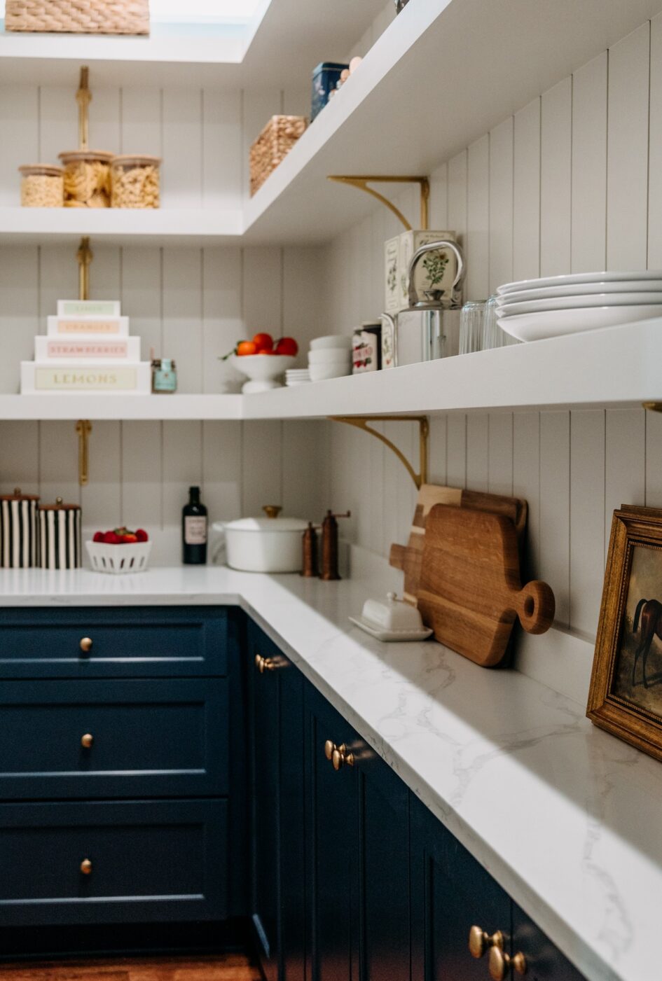 We gave them a walk-in pantry, updated the mudroom, added lots and lots of trim detail including a coffered ceiling in their family room, helped them create a little separation in their spaces with new archways and lighting, and created a feature wall with walnut accented built-ins.