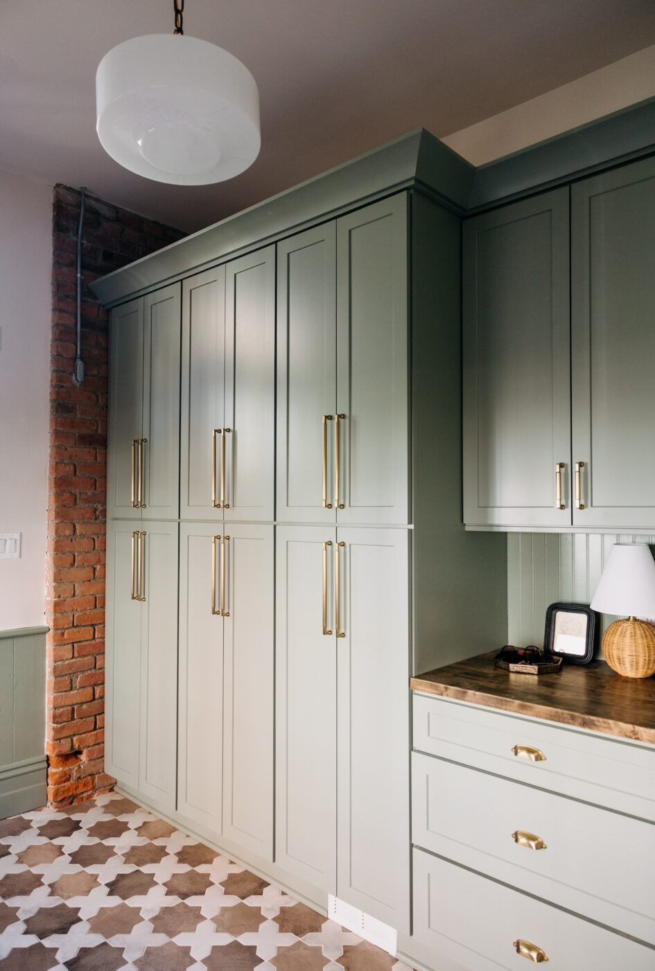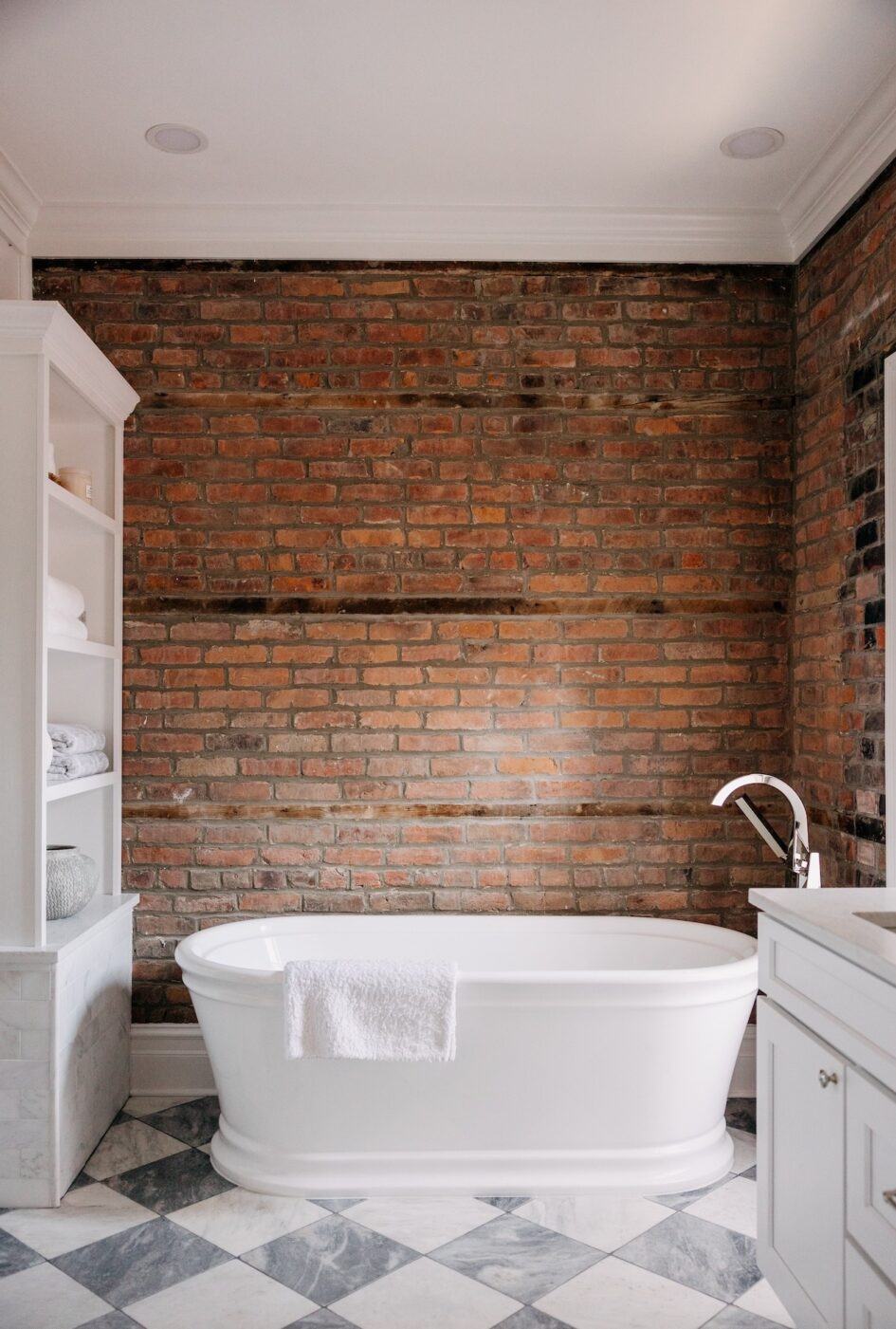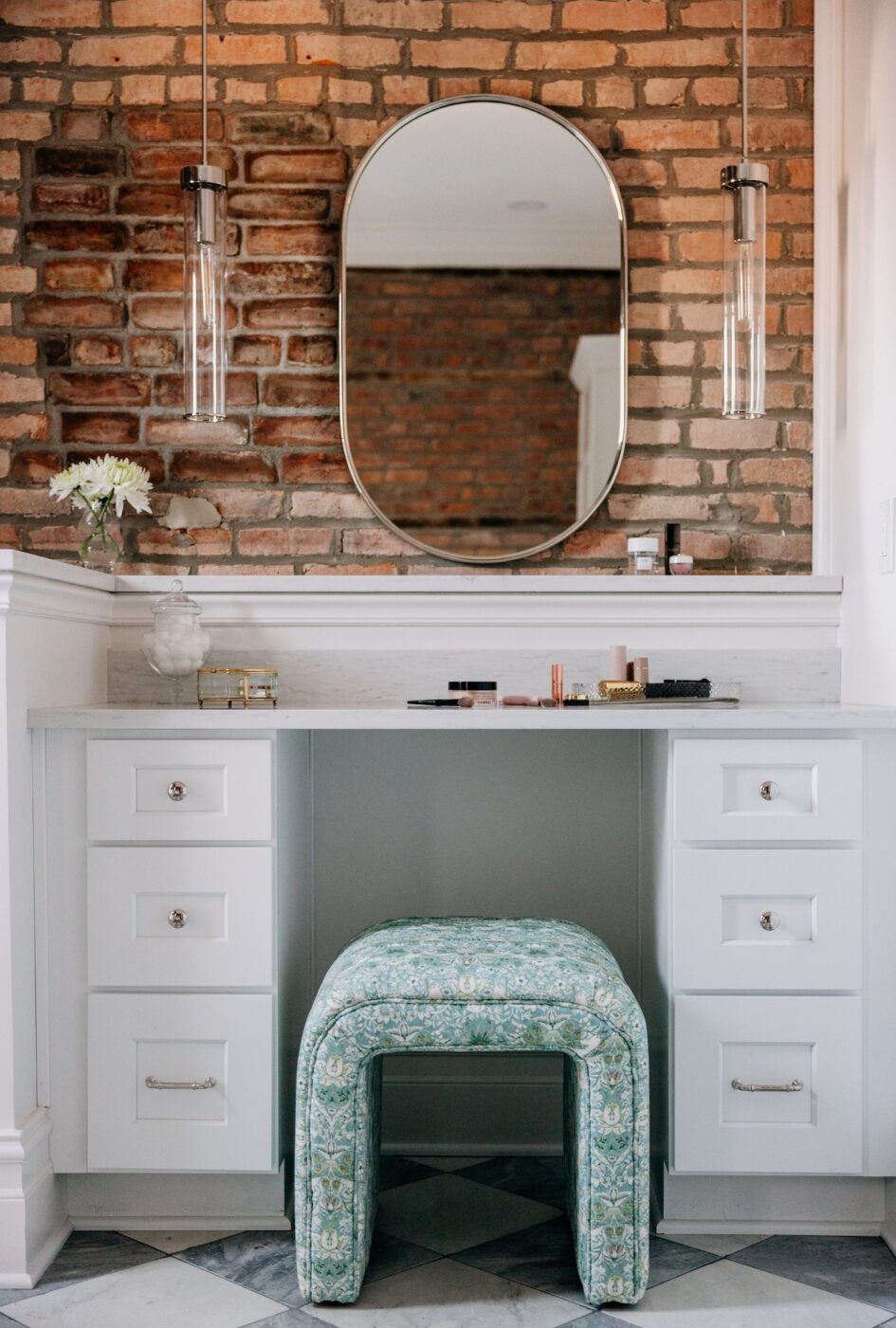 Our palette was hand-carved wood work to refinish and restore, exposed brick to play with, 10 foot ceilings and large, open spaces that accommodated creative floor plans. Of course we brought in historically accurate materials including marble, mosaic tile, classic cabinetry, polished nickel hardware. But it’s the modern, fun pops of lighting, custom built-ins, Detroit Wallpaper and incorporation of color is what makes this project so magazine-worthy .